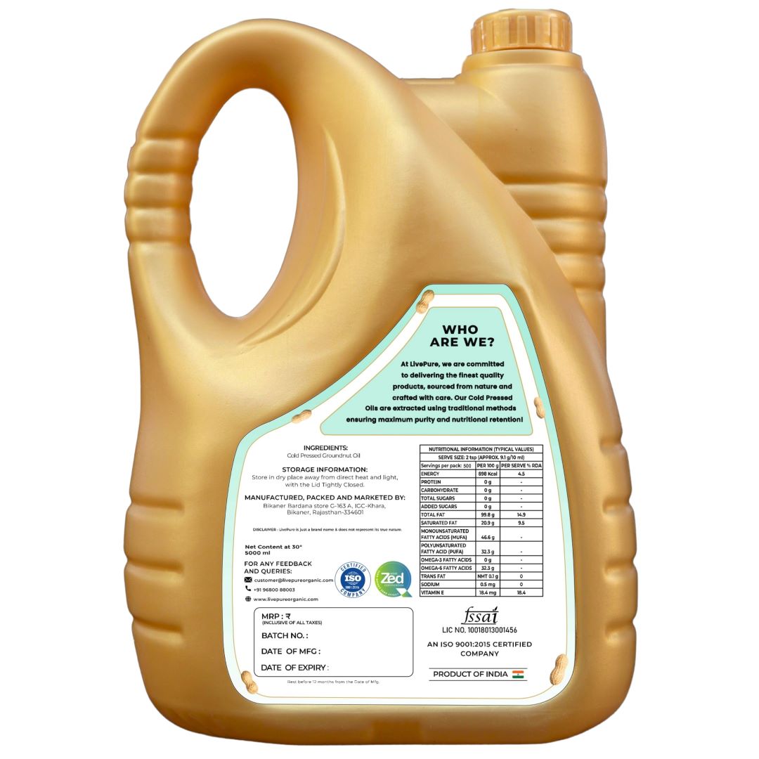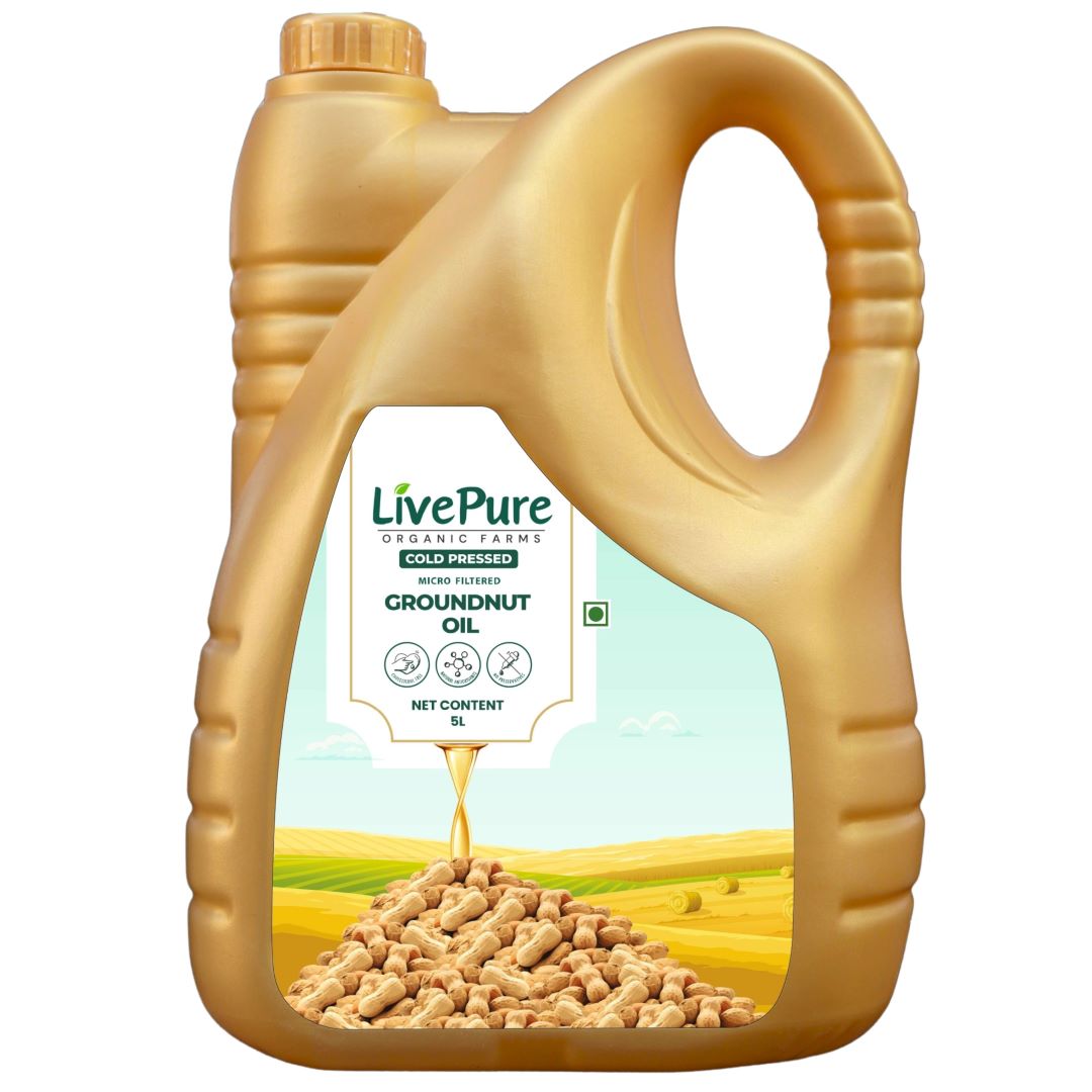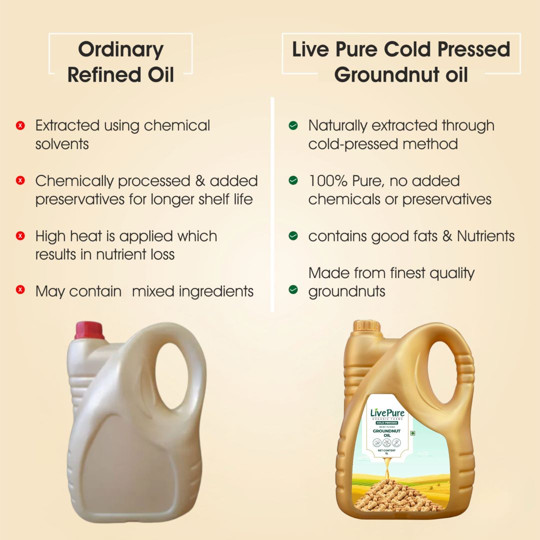 - COLDPRESSED GROUNDNUT OIL : Say goodbye to harmful chemicals and refined oil that strip away essential nutrients. LivePure Cold Pressed Kacchi Ghani Groundnut Oil is crafted using a traditional wooden press at low temperatures to retain every bit of its natural goodness. No additives, no preservatives – just the rich, nutty flavor of premium G-10 groundnuts, sourced exclusively from the fertile lands of Rajasthan.